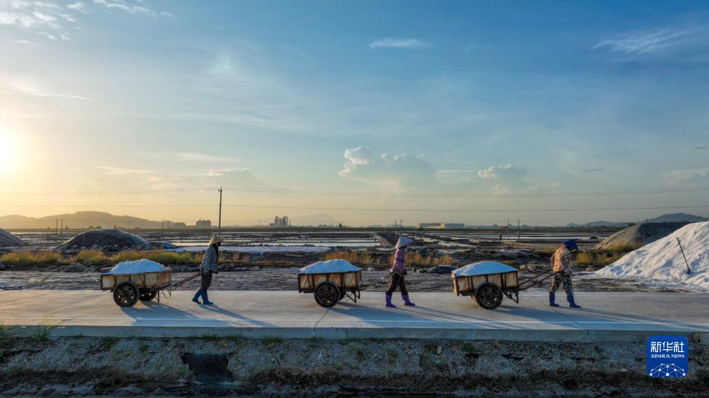 8月26日,在福建省莆田市秀嶼區東嶠鎮的莆田鹽場(chǎng),工人們在運輸海鹽(無(wú)人機照片)。