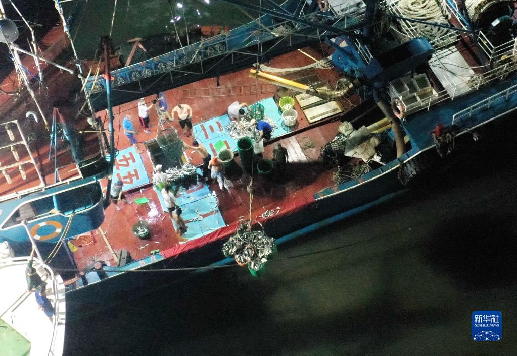 8月26日,漁民在寧德市霞浦縣三沙中心漁港的漁船上卸下漁獲(無(wú)人機照片)。