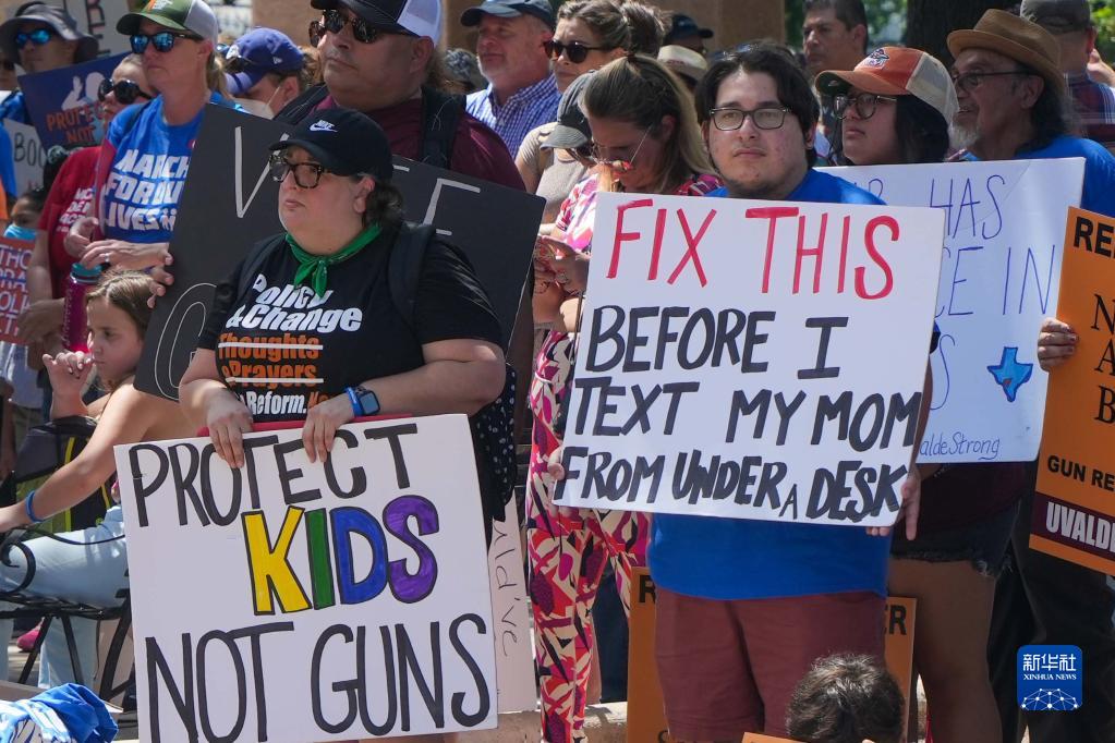 當日,包括得州小學(xué)槍擊案遇難者親屬在內的抗議者在奧斯汀市舉行集會(huì )呼吁控槍。5月24日發(fā)生在得州尤瓦爾迪市羅布小學(xué)的槍擊案造成19名小學(xué)生和兩名教師死亡,震動(dòng)全美。