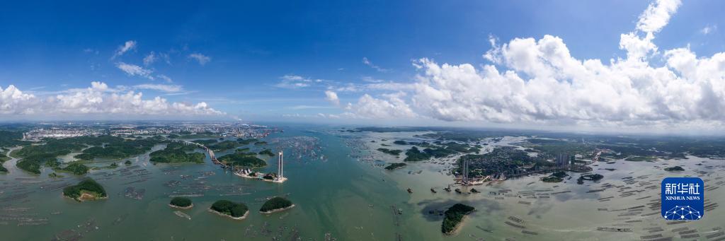 這是8月27日拍攝的平陸運河出??诟浇拿┪埠}堥T(mén)大橋段水域(無(wú)人機全景照片)。
