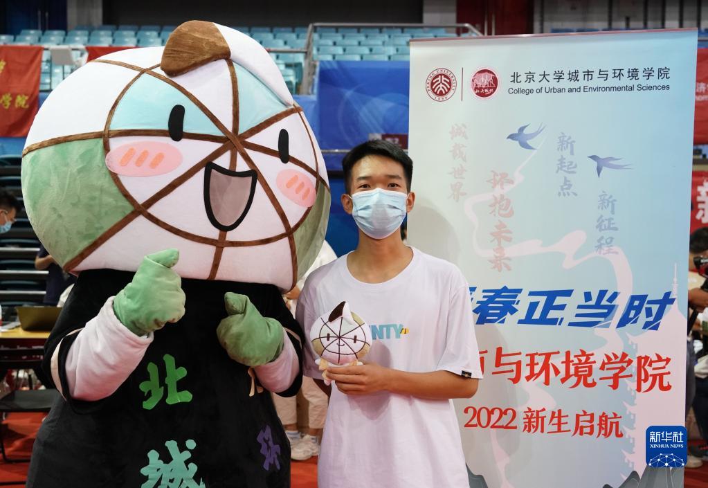 8月28日,在北京大學(xué)邱德拔體育館,一名北京大學(xué)城市與環(huán)境學(xué)院2022級本科新生拍照留念。