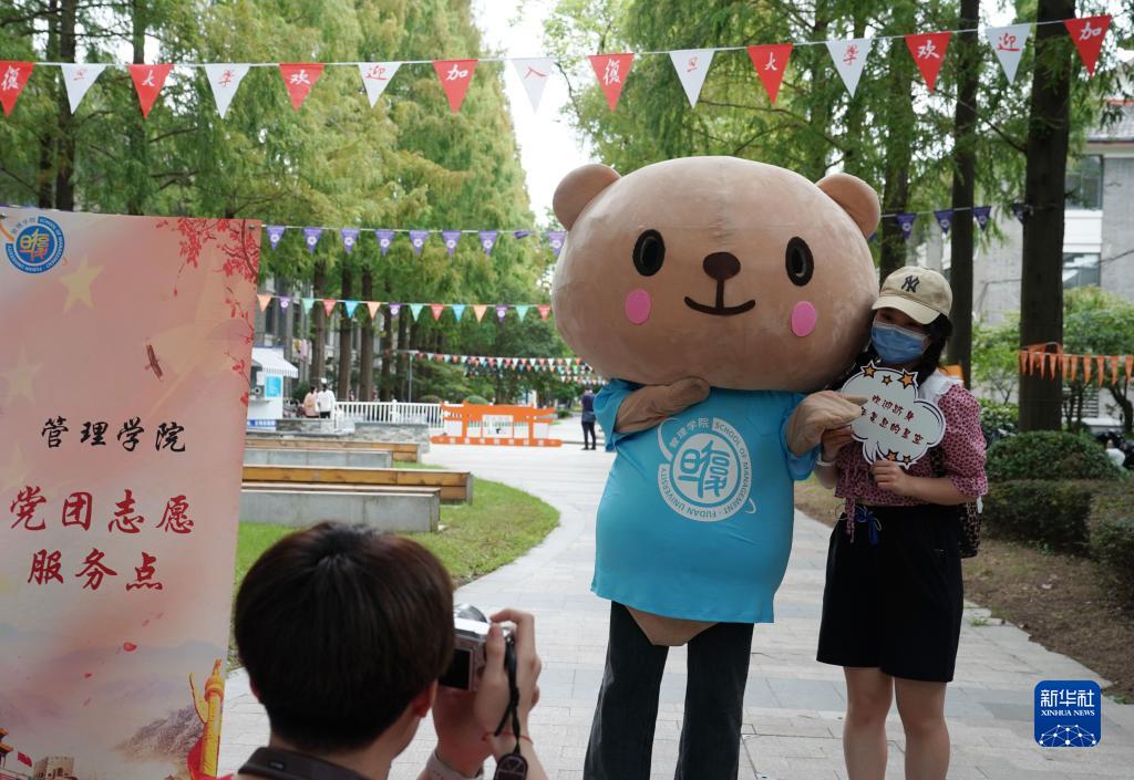 8月28日,復旦大學(xué)管理學(xué)院新生與學(xué)院的吉祥物玩偶合影。