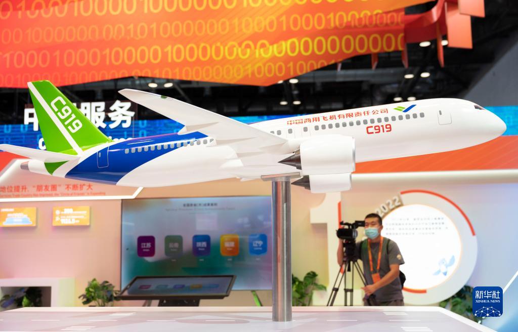 8月28日,在國家會(huì )議中心舉行的服貿會(huì )媒體探營(yíng)活動(dòng)中,記者拍攝C919飛機模型。