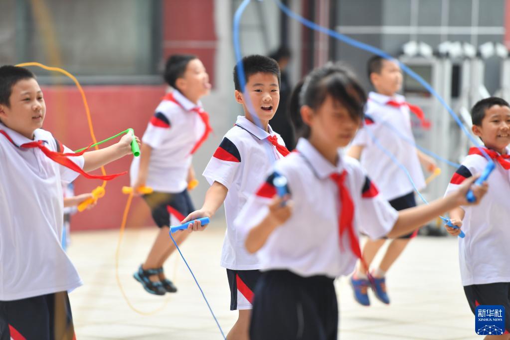 8月29日,在長(cháng)沙市天心區青園南湖小學(xué),學(xué)生在體育課上跳繩。