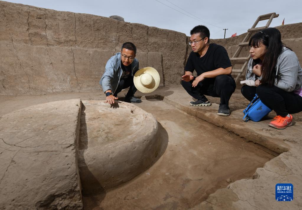 來(lái)自西北工業(yè)大學(xué)文化遺產(chǎn)研究院的考古隊員(左一)在南佐遺址核心區大型宮殿建筑發(fā)掘現場(chǎng)展示以“白灰面”鋪就的灶臺遺跡(8月23日攝)。