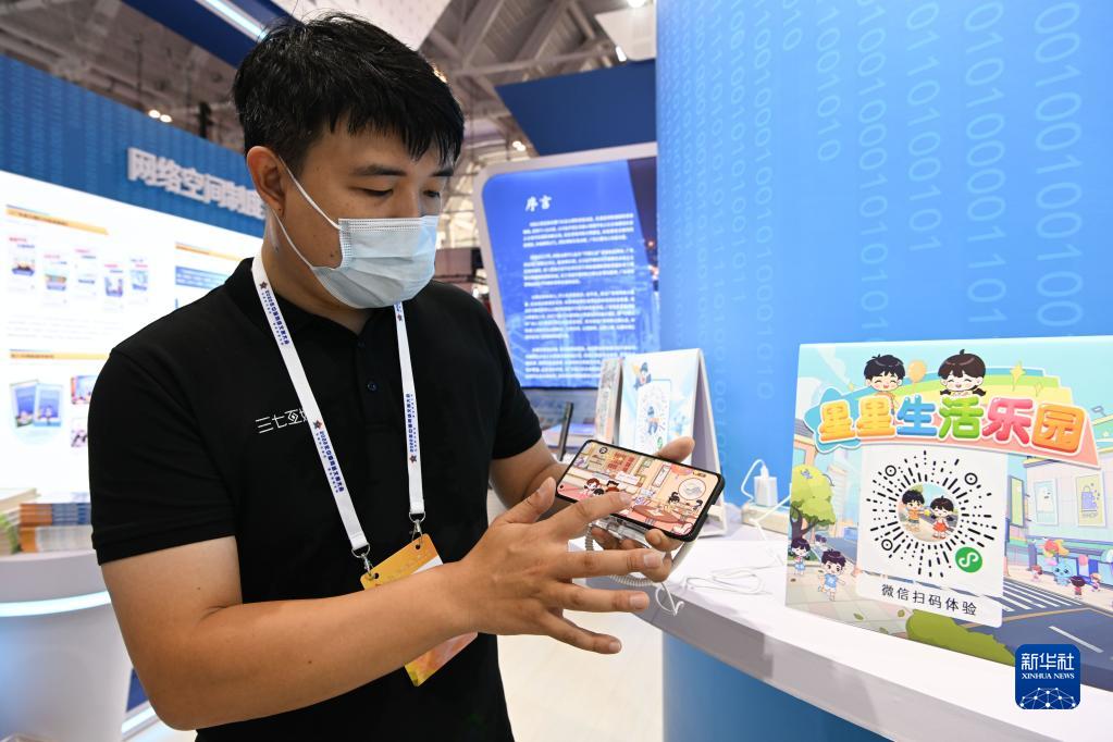 8月28日,在國家會(huì )展中心(天津),參展人員在2022年中國網(wǎng)絡(luò )文明大會(huì )上展示一款為孤獨癥兒童開(kāi)發(fā)的功能性應用軟件。