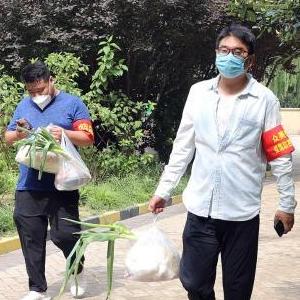 8月30日,在石家莊市眾美綠都小區,社區志愿者為社區居民送生活物資。