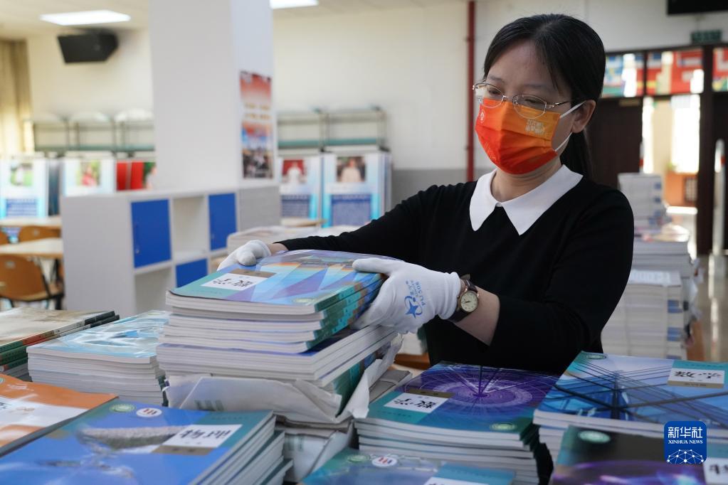 8月30日,北京市中關(guān)村中學(xué)圖書(shū)館的老師在分發(fā)教材。