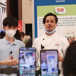 8月30日,一名來(lái)自法國的美食主播在對接會(huì )現場(chǎng)直播美食制作。