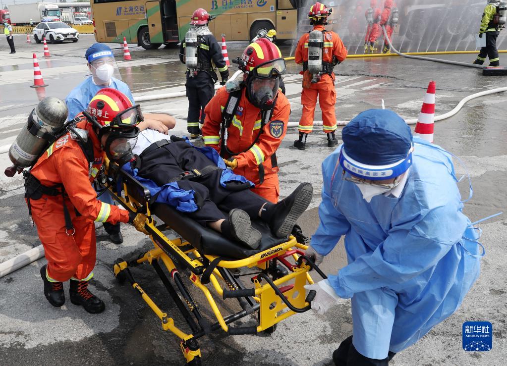 8月30日,急救人員與消防員在演練中用擔架轉運“受傷人員”。