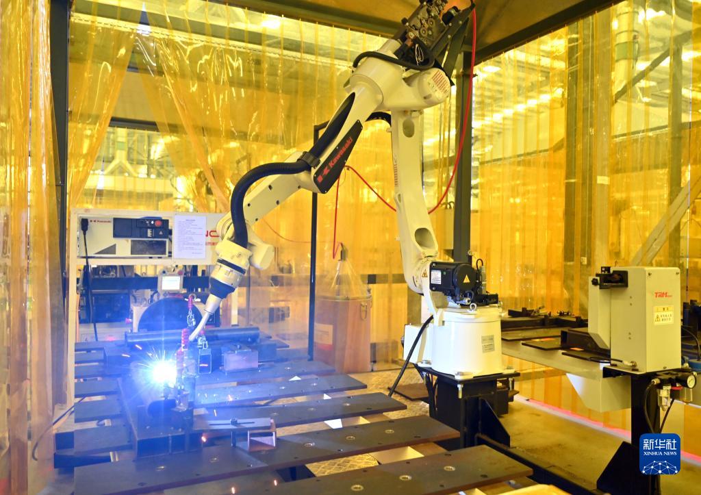 8月30日,在日照經(jīng)濟技術(shù)開(kāi)發(fā)區一家企業(yè)加工車(chē)間,機械手臂對動(dòng)感單車(chē)結構件進(jìn)行自動(dòng)焊接。