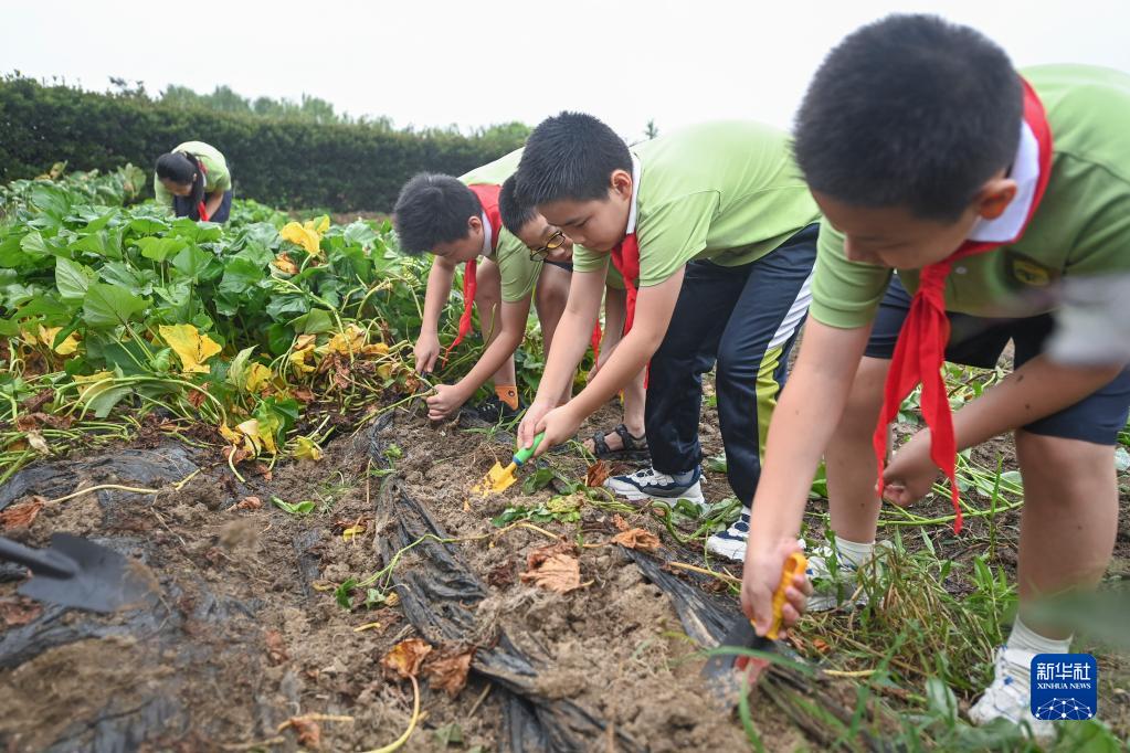 當日,在浙江省嘉興市南湖區新豐鎮中心小學(xué)的校園農場(chǎng)內,學(xué)生們參加收番薯、除草、澆水等特色勞動(dòng)課程,開(kāi)啟新學(xué)期的“開(kāi)學(xué)第一課”。新豐鎮中心小學(xué)是浙江省拓寬校外勞動(dòng)實(shí)踐途徑試點(diǎn)學(xué)校,依托校園農場(chǎng)形成了特色鮮明的勞動(dòng)課程。