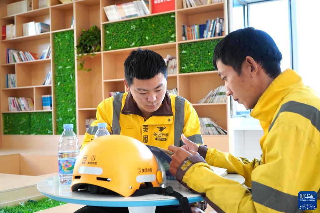 8月31日,在單縣園藝街道黃樓社區“暖新驛站”,兩名外賣(mài)配送員在閱讀。
