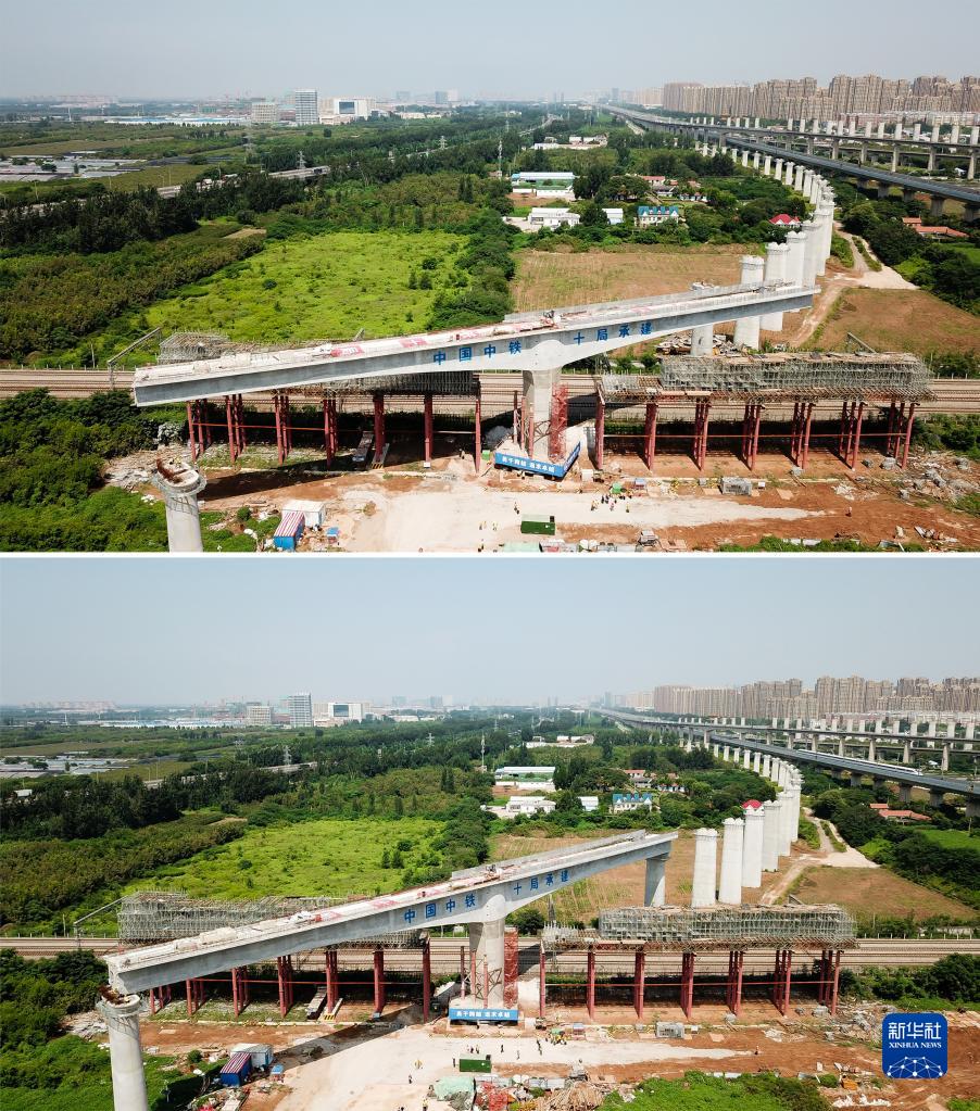 拼版照片:上圖為8月31日,由中鐵十局承建的濟鄭高鐵(山東段)跨京滬鐵路轉體橋正在進(jìn)行“轉身”作業(yè)(無(wú)人機照片);下圖為8月31日,濟鄭高鐵(山東段)跨京滬鐵路轉體橋完成“轉身”作業(yè)。