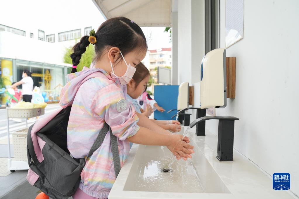 9月1日,在上海市徐匯區科技幼兒園,孩子們在水池前洗手。