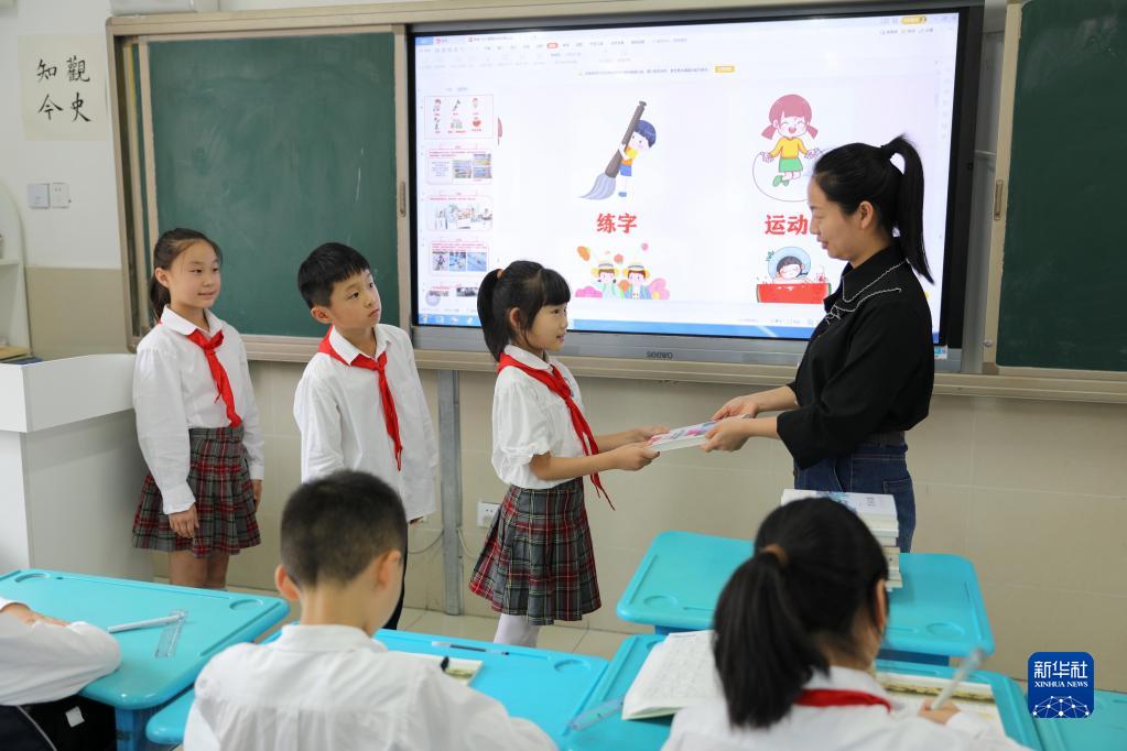 9月1日,安徽合肥市六安路小學(xué)翠微分校的老師向四年級學(xué)生贈送圖書(shū)。
