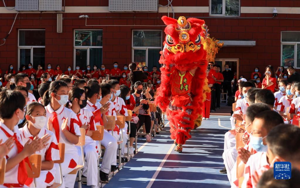 9月1日,中國人民大學(xué)附屬中學(xué)分校的師生在開(kāi)學(xué)典禮上進(jìn)行舞獅舞龍表演。
