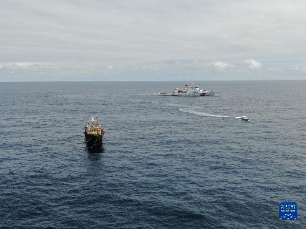 巡航期間,長(cháng)山艦編隊施放執法艇對在北太平洋公海作業(yè)的漁船進(jìn)行查證(7月31日攝,無(wú)人機照片)。
