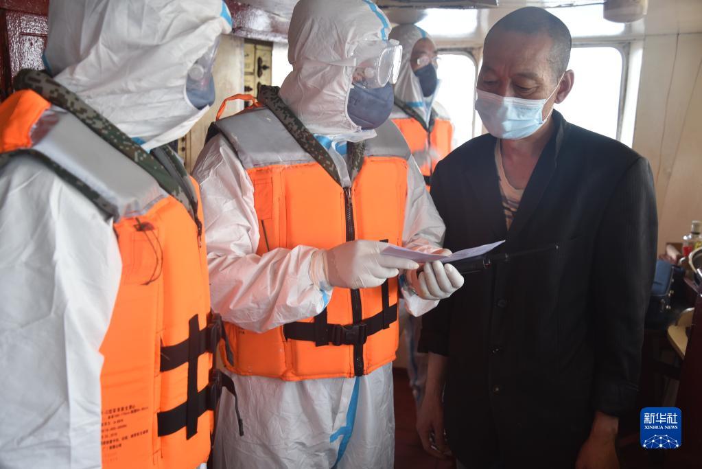 巡航期間,海警執法員對在北太平洋公海作業(yè)的漁船進(jìn)行登臨檢查(7月31日攝)。