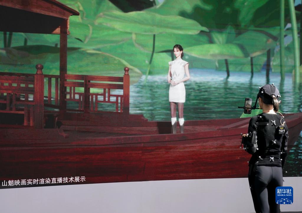 9月1日,參展人員在服貿會(huì )首鋼園區文旅服務(wù)展館展示一款映畫(huà)實(shí)時(shí)渲染直播技術(shù)。新華社記者 張晨霖 攝
