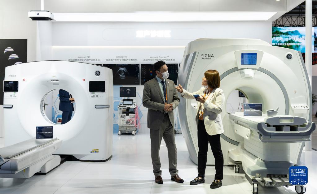 9月1日,在國家會(huì )議中心一處醫療設備展臺,工作人員在介紹醫療設備情況。新華社記者 才揚 攝