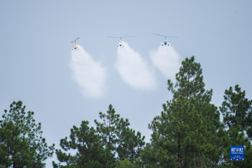 9月1日,在湖南株洲蘆淞機場(chǎng),飛行員進(jìn)行旋翼機編隊飛行表演。