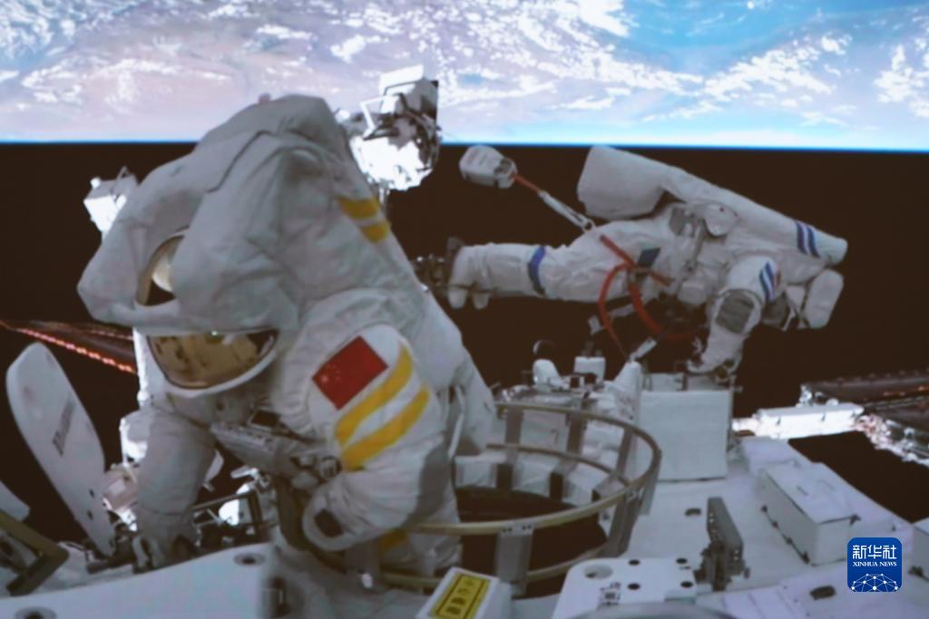 9月1日在北京航天飛行控制中心拍攝的航天員陳冬(右)、劉洋(左)開(kāi)展艙外操作的畫(huà)面。