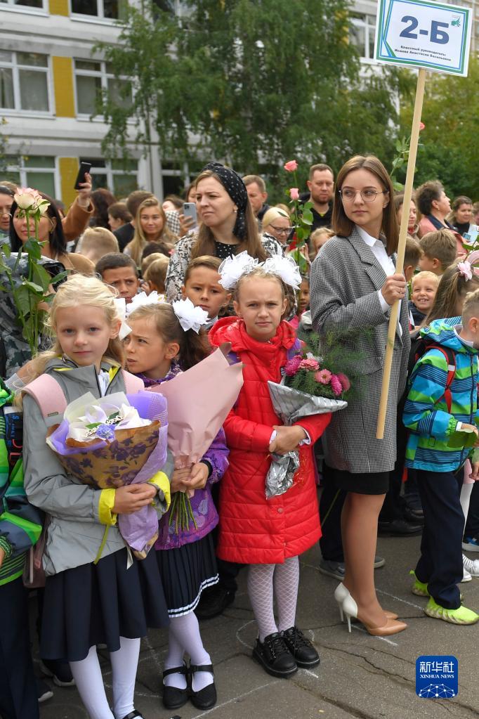 9月1日,在俄羅斯首都莫斯科,學(xué)生們捧著(zhù)花束參加開(kāi)學(xué)典禮。