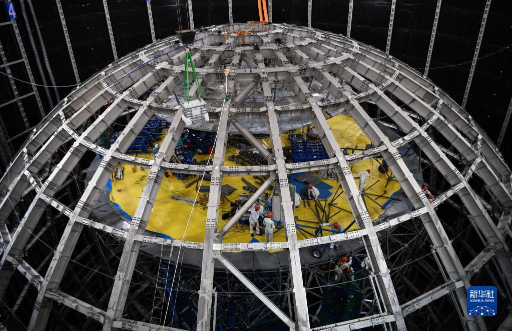9月2日,工作人員在江門(mén)中微子實(shí)驗探測器不銹鋼結構內部的升降平臺上安裝作業(yè)。新華社記者 鄧華 攝
