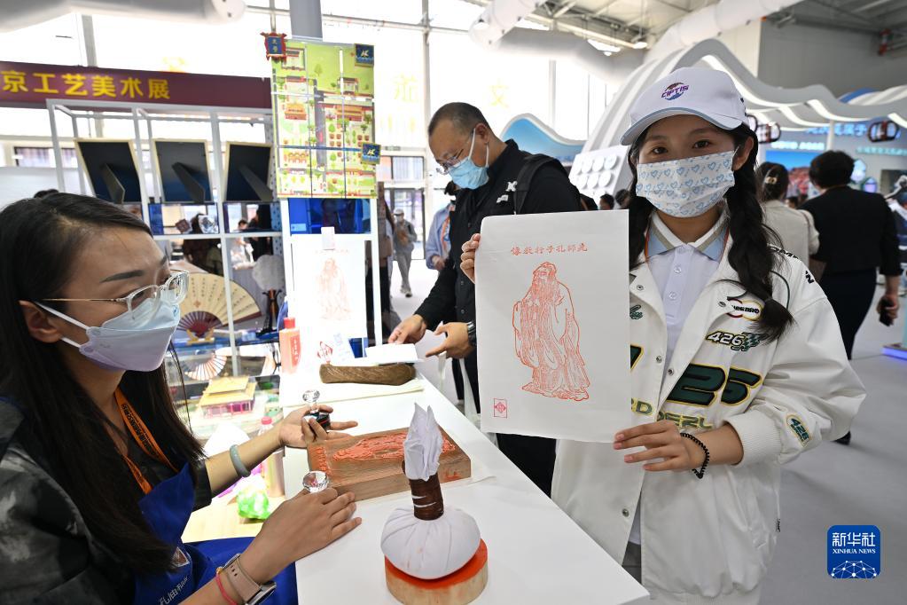 9月2日,一名觀(guān)眾在孔廟和國子監博物館展臺體驗雕版印刷。新華社記者 李鑫 攝