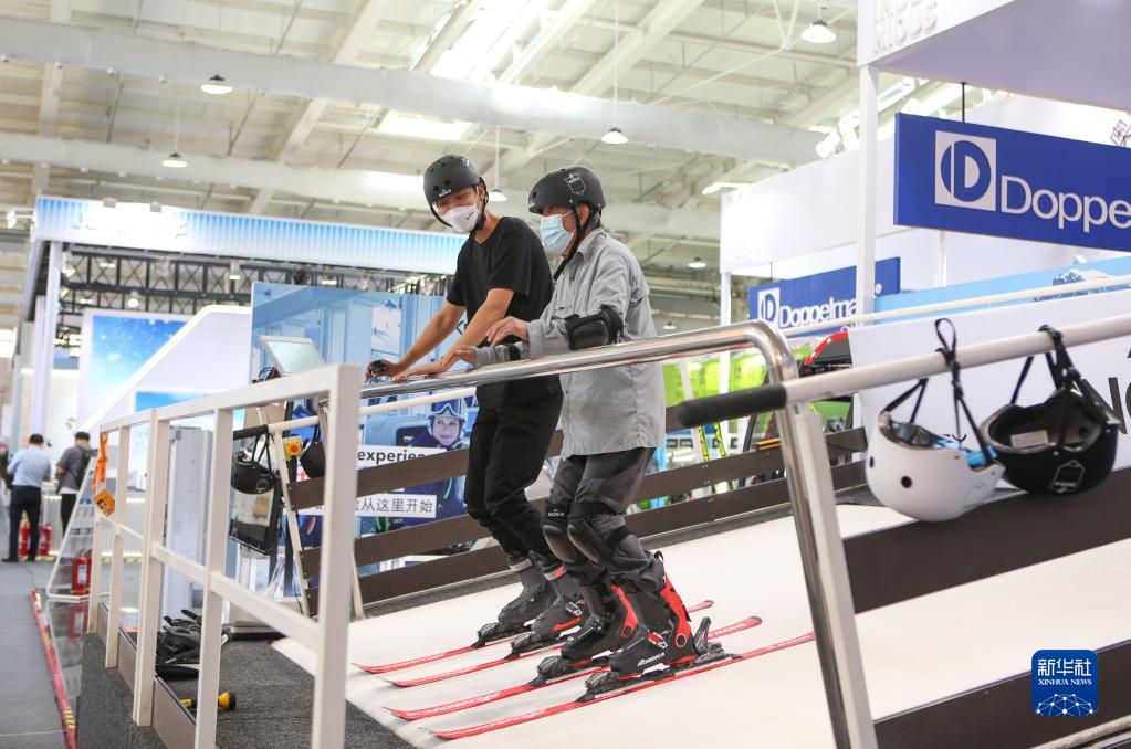 9月1日,一名老人(右)在服貿會(huì )體育服務(wù)專(zhuān)題展區體驗滑雪模擬設備。新華社記者 張帆 攝