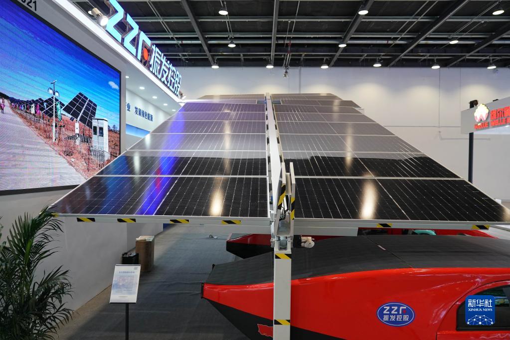 9月2日在環(huán)境服務(wù)專(zhuān)題展區拍攝的光伏跟蹤模塊系統。