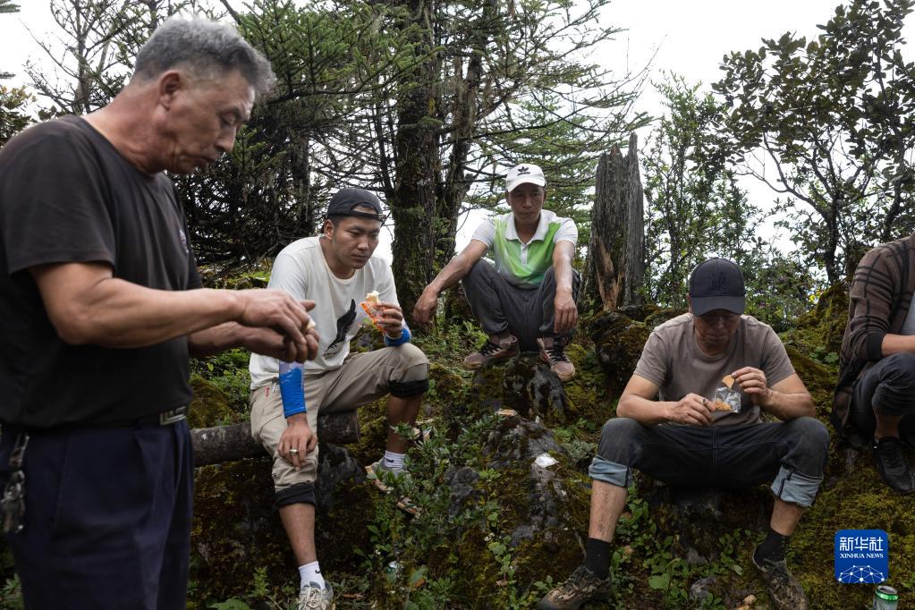 瀘沽湖馬幫隊隊員們在抵達牛窩子山山頂后吃干糧(9月1日攝)。