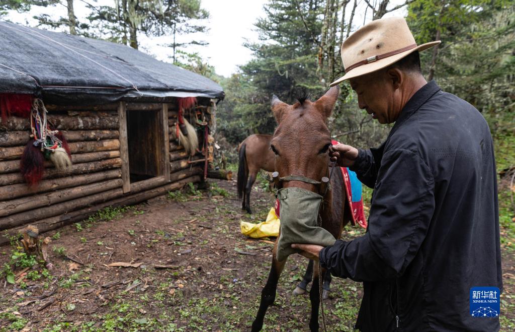 瀘沽湖馬幫隊隊長(cháng)楊直之在營(yíng)地為給牲口喂口糧,為下山做準備(9月2日攝)。