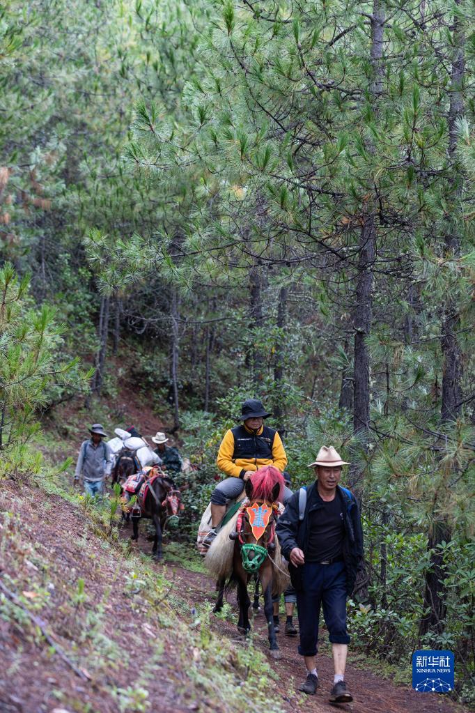 游客騎著(zhù)瀘沽湖馬幫隊騾子下山(9月2日攝)。