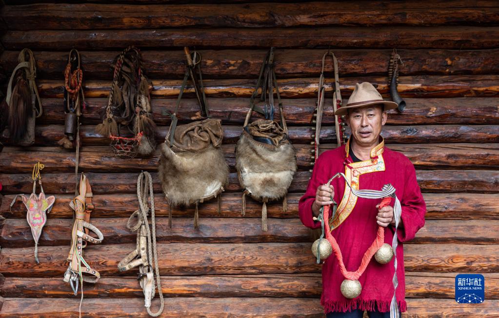 瀘沽湖馬幫隊隊長(cháng)楊直之在自建的摩梭馬幫文化館里展示馬幫用具和飾品(9月1日攝)。