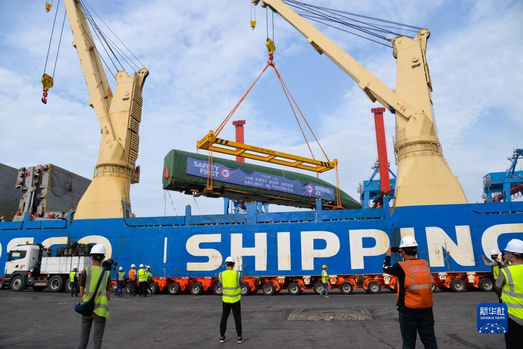 9月2日,在印度尼西亞雅加達丹戎不碌港舉行的運抵儀式上,雅萬(wàn)高鐵高速動(dòng)車(chē)組在港口卸船。