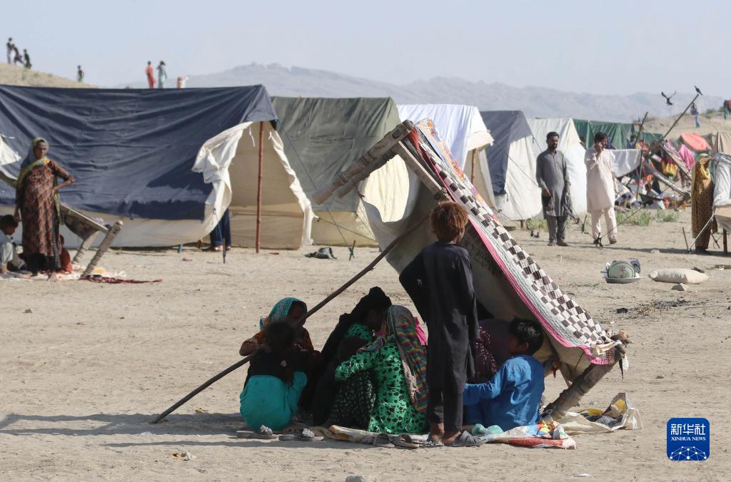 這是9月1日在巴基斯坦南部信德省受洪水影響的賈姆舒魯地區拍攝的受災民眾。