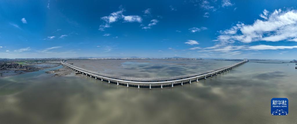 這是9月2日拍攝的新建福廈鐵路泉州灣跨海大橋(無(wú)人機合成照片)。