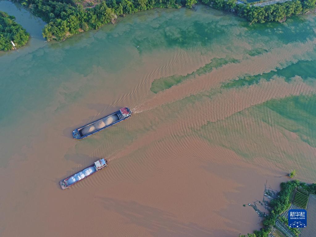 廣西南寧市江南區江西鎮三江口水域,左江與右江水在交匯處清濁交融(9月3日攝,無(wú)人機照片)。
