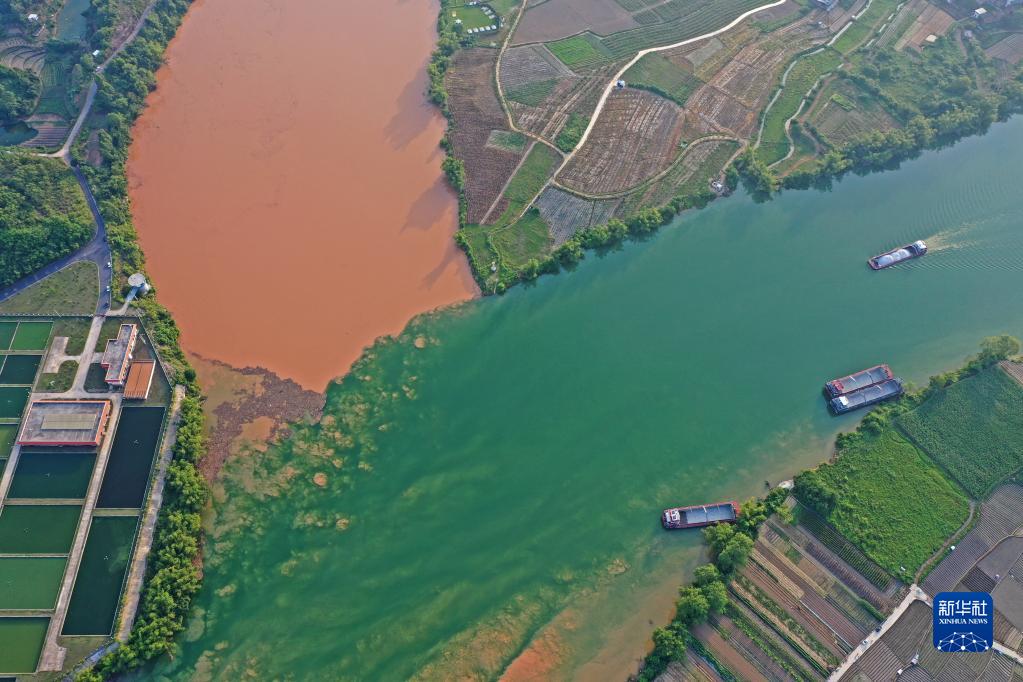 廣西南寧市江南區江西鎮三江口水域,左江與右江水在交匯處清濁交融(9月3日攝,無(wú)人機照片)。