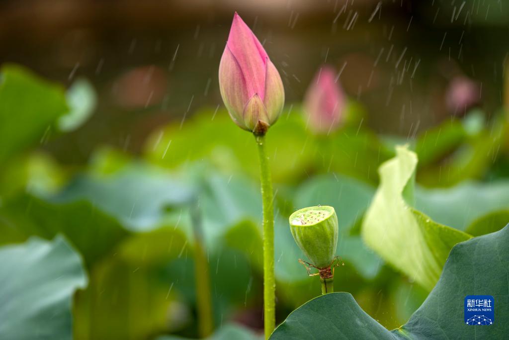 9月3日在江蘇省泰州市海陵區一處池塘里拍攝的雨中荷花。