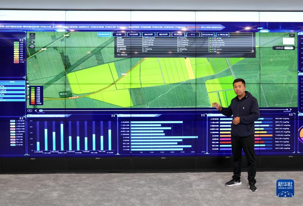 9月2日,在位于富錦市萬(wàn)畝水稻科技示范園內的富錦市現代農業(yè)信息服務(wù)中心,工作人員在介紹水稻種植的整體情況。