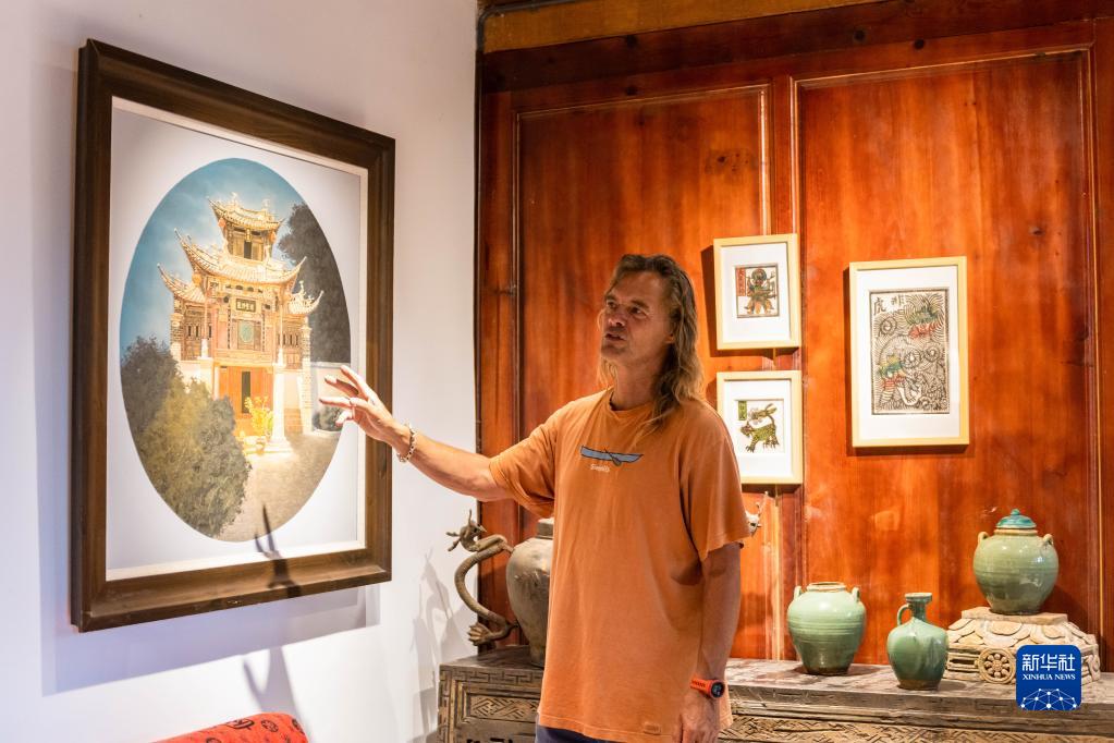 8月30日,林登在沙溪鎮石龍村村史館介紹當地藝術(shù)家的作品。