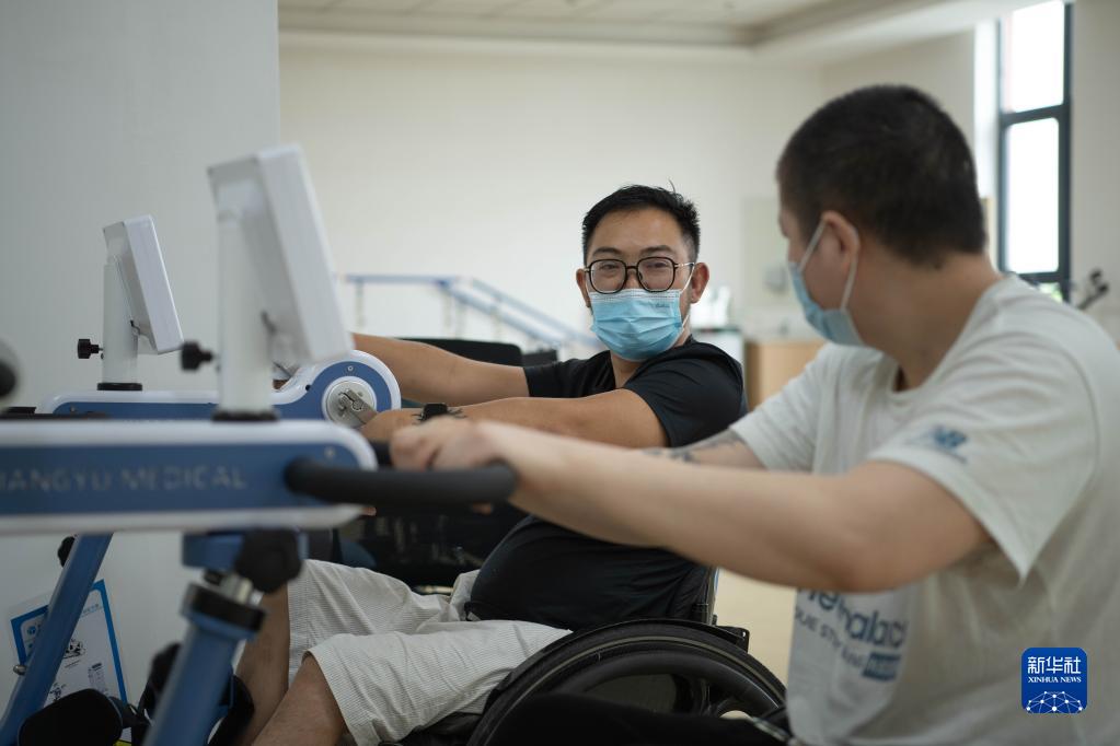 7月14日,在成都市溫江區一家康復醫院內,何鵬(左)陪輪友一起使用四肢聯(lián)動(dòng)康復儀訓練。