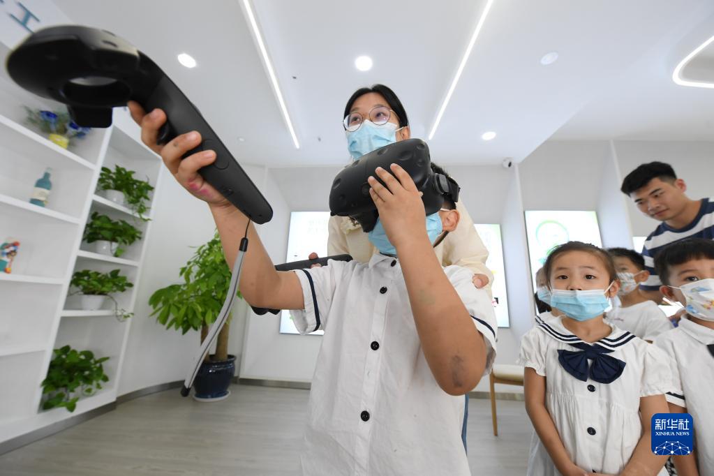 9月6日,在位于湖州吳興區愛(ài)山街道的垃圾分類(lèi)宣教館,老師帶著(zhù)孩子做VR趣味游戲。