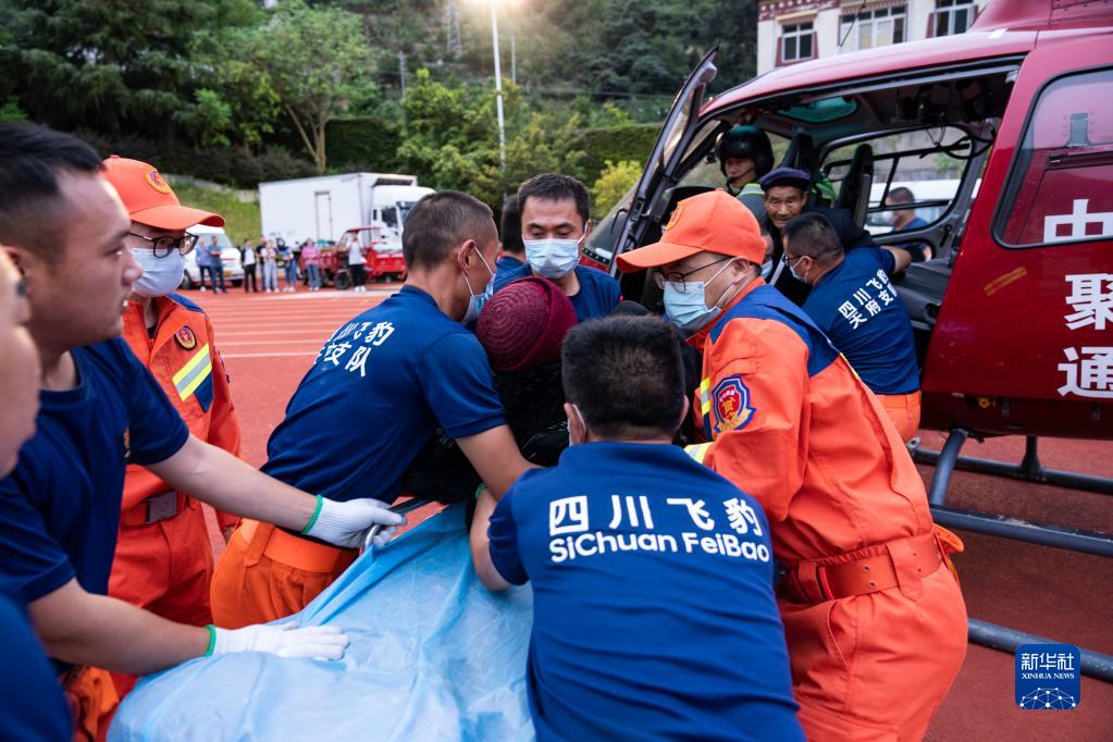 9月6日,在石棉縣中學(xué)的臨時(shí)起降點(diǎn),救援人員在運送一名從石棉縣幸福村轉運來(lái)的受傷老人。