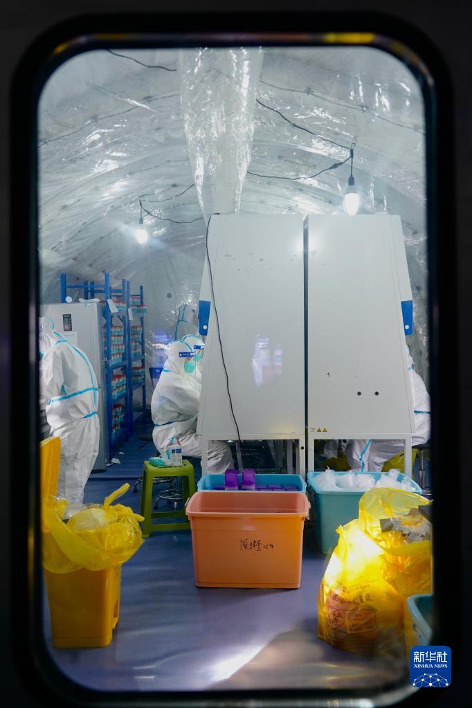 9月5日,核酸檢測隊工作人員在氣膜方艙實(shí)驗室內的標本制備區處理樣本。
