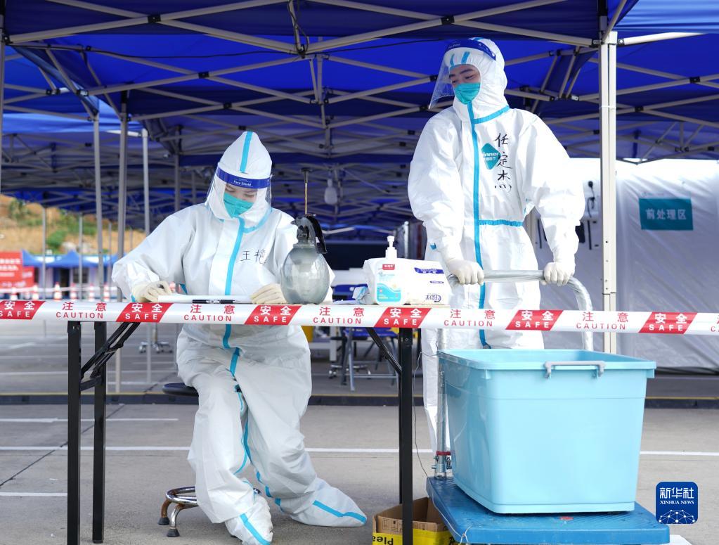 9月5日,氣膜方艙實(shí)驗室核酸檢測隊工作人員在等待收樣。