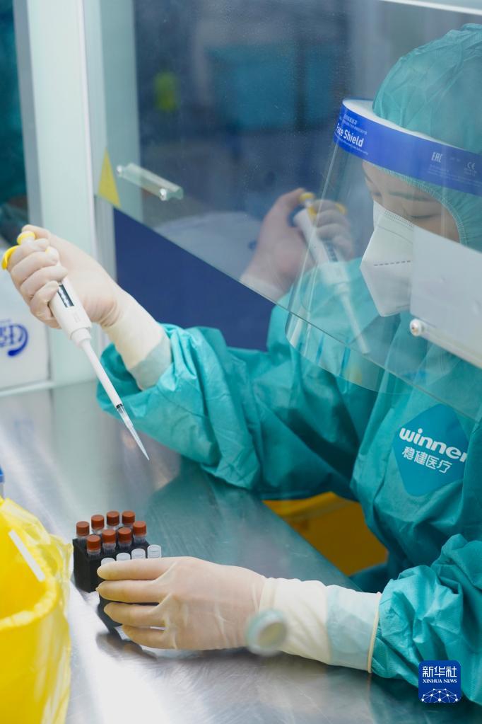 9月5日,核酸檢測隊工作人員在氣膜方艙實(shí)驗室內配制試劑。